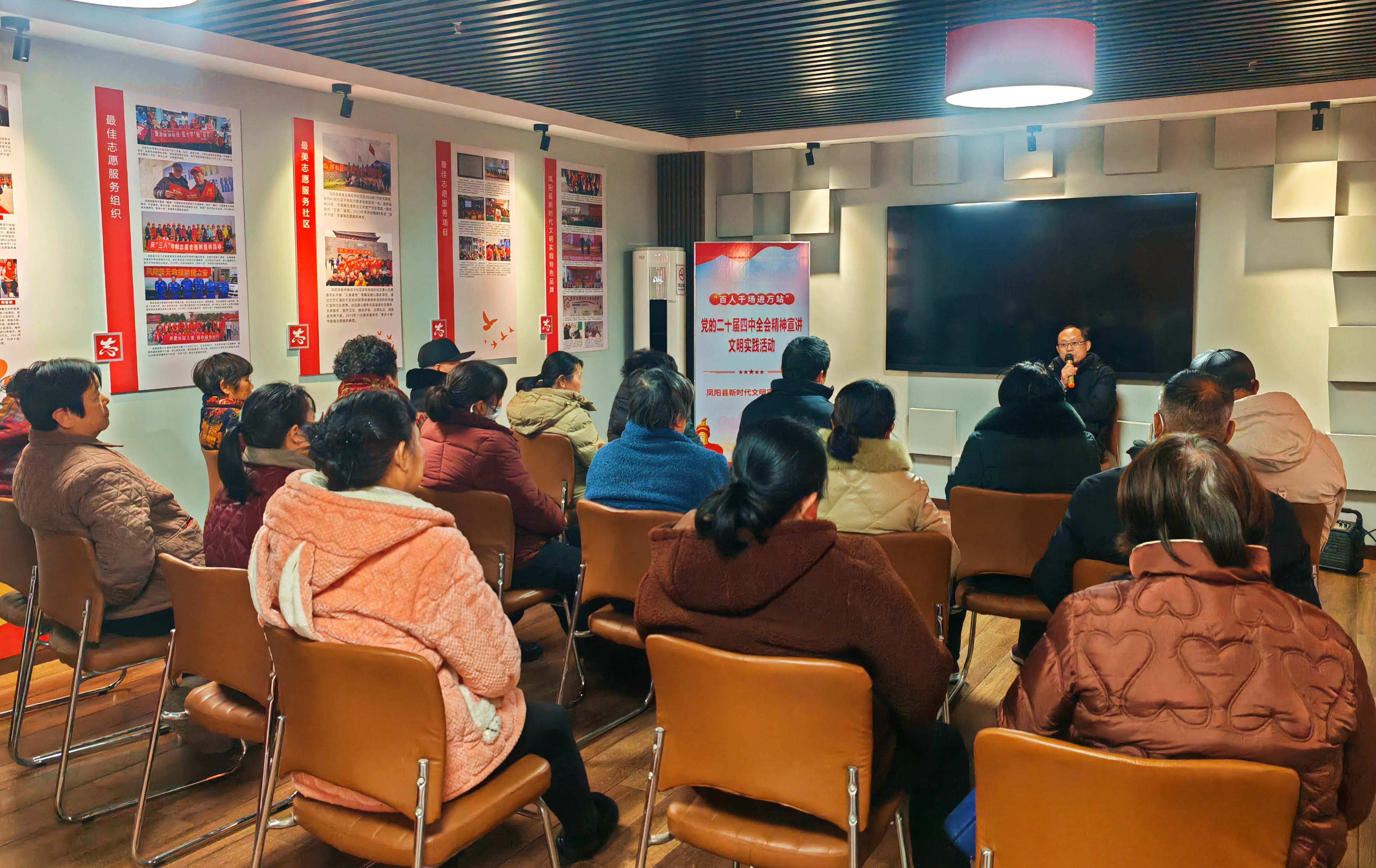 凤阳县依托覆盖县、乡镇(街道)、村(社区)三级的新时代文明实践中心(所、站),以及室内外新时代文明实践大舞台,使其成为理论传播的“神经末梢”和群众身边的“精神家园”,织密理论宣讲的网络。1月8日,县新时代文明实践中心与武店镇新时代文明实践所联动宣讲,把理论政策送到乡村群众身边;各级文明实践阵地不仅是宣讲课堂,更是综合服务平台,大溪河镇指王村将文明实践大讲堂作为群众围坐学习的“好去处”,中都街道如意社区新时代文明实践站就是社区“19点议事会”的“老地方”。