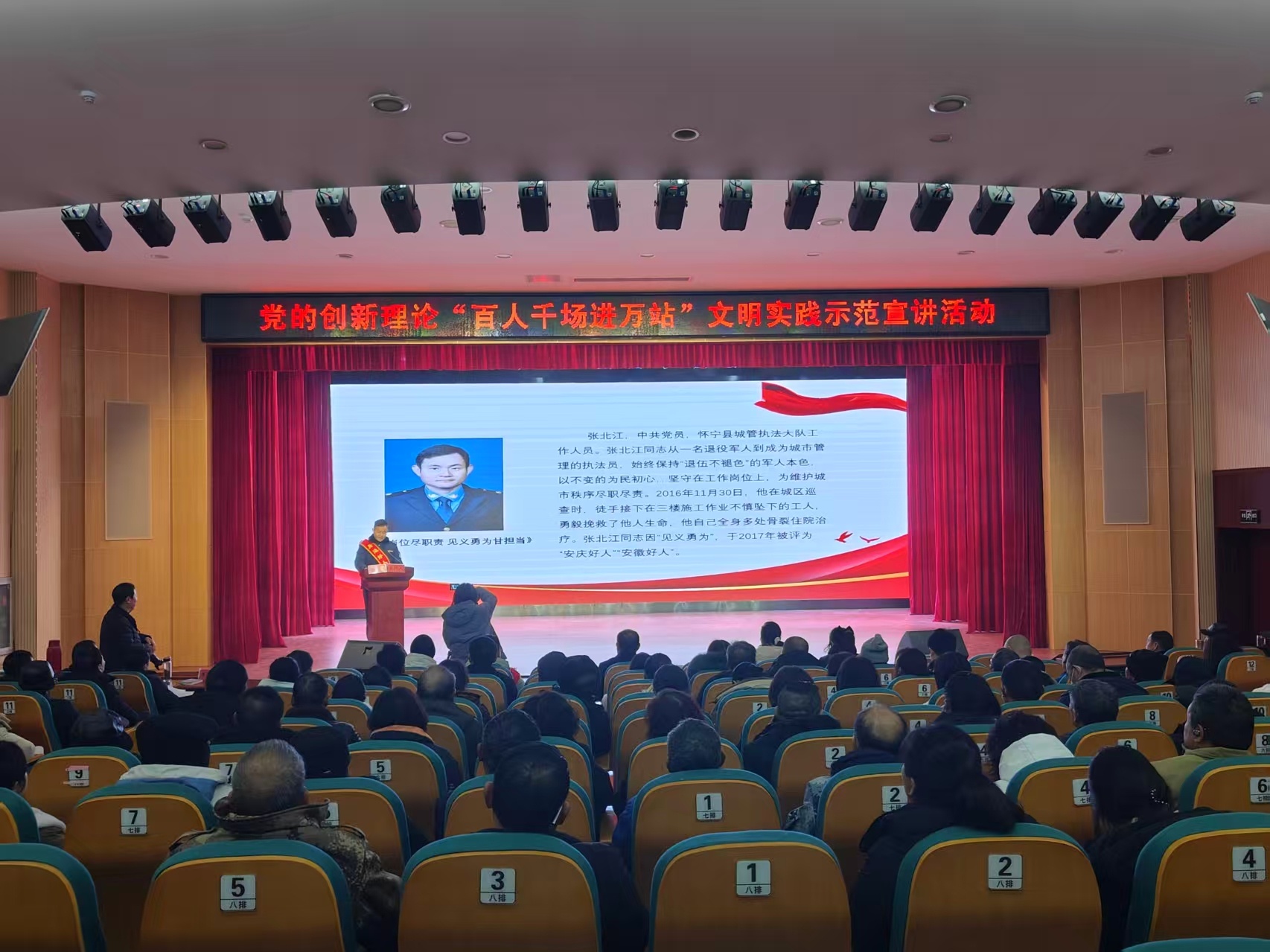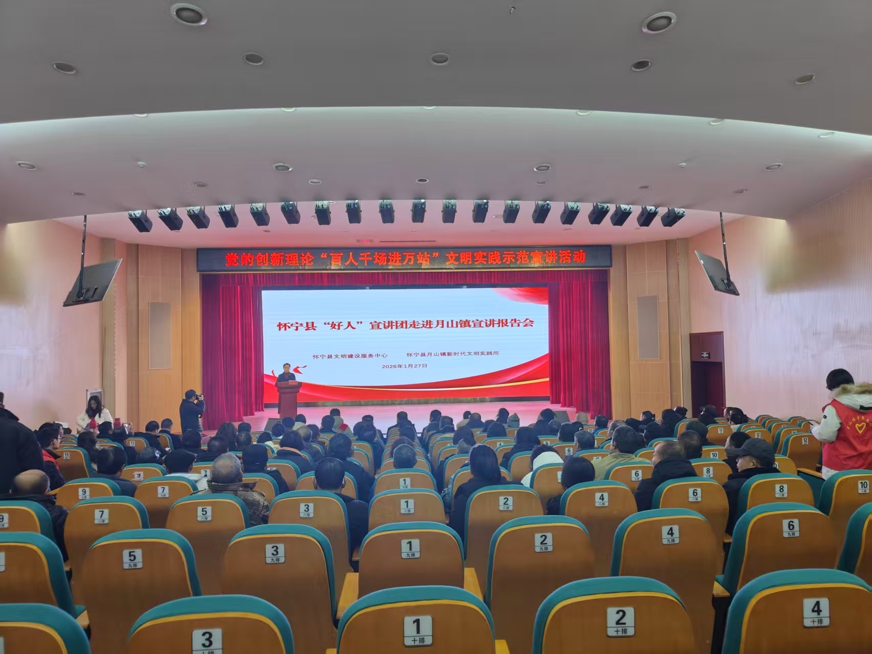 为深入学习宣传贯彻党的创新理论,大力弘扬“中国好人”精神,近日,安徽省安庆市怀宁县“好人”宣讲团走进怀宁县月山镇新时代文明实践所,开展党的创新理论“百人千场进万站”文明实践示范宣讲。月山镇机关事业单位党员干部,各村(社区)干部、村民组长及群众代表等共计100余人参会聆听。