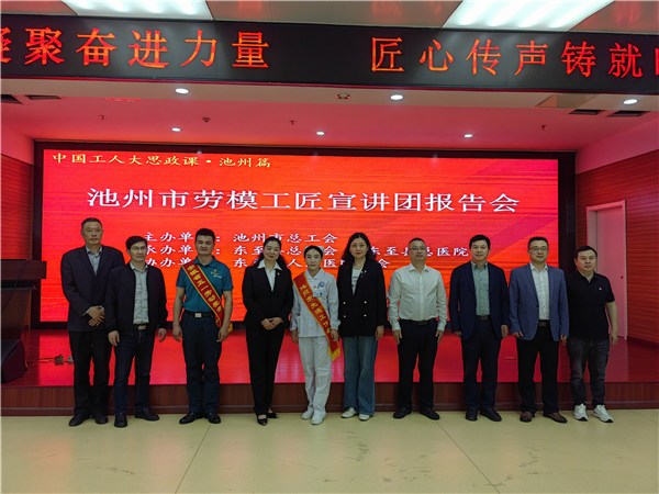 4月27日上午,由池州市总工会主办、东至县总工会承办的“劳模铸魂凝聚奋进力量·匠心传声铸就时代荣光”劳模工匠宣讲团报告会,在东至县人民医院四楼报告厅举行。池州市总工会党组成员、副主席严贞,东至县人大常委会副主任黄光明等领导及全县医疗系统240余名职工代表现场聆听报告,感受榜样力量。